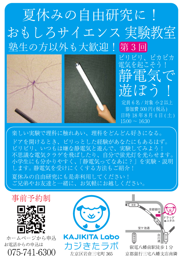 今回のサイエンス教室は6名様限定になります。参加料が一般・会員様ともに500円になります。一般の方は当日教室までお持ちください。会員様は翌月末のお月謝でまとめてお支払いして頂けます。