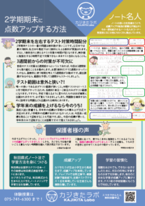 裏面は、中学生や高校生の2学期期末テストで逆転する方法について触れています。2学期の期末テストは教科数が最大で実施されます。中間テストとは異なるテスト対策が必要となるので事前にチェックしておきましょう。