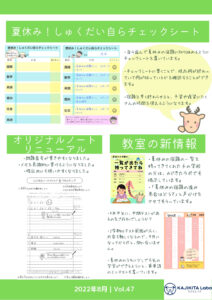カジきたラボでは、長い夏休みにおける宿題をきちんとできるかどうかチェックし、生徒さんの学習の進捗を見守っています。その時に用いる、「しゅくだい自らチェックシート」を裏面で紹介しています。