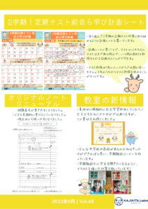 カジきたラボでは、2学期の定期テストを事前に計画・チェックし、生徒さんの学習の進捗を見守っています。その時に用いる、「定期テスト前自ら学び計画シート」を裏面で紹介しています。